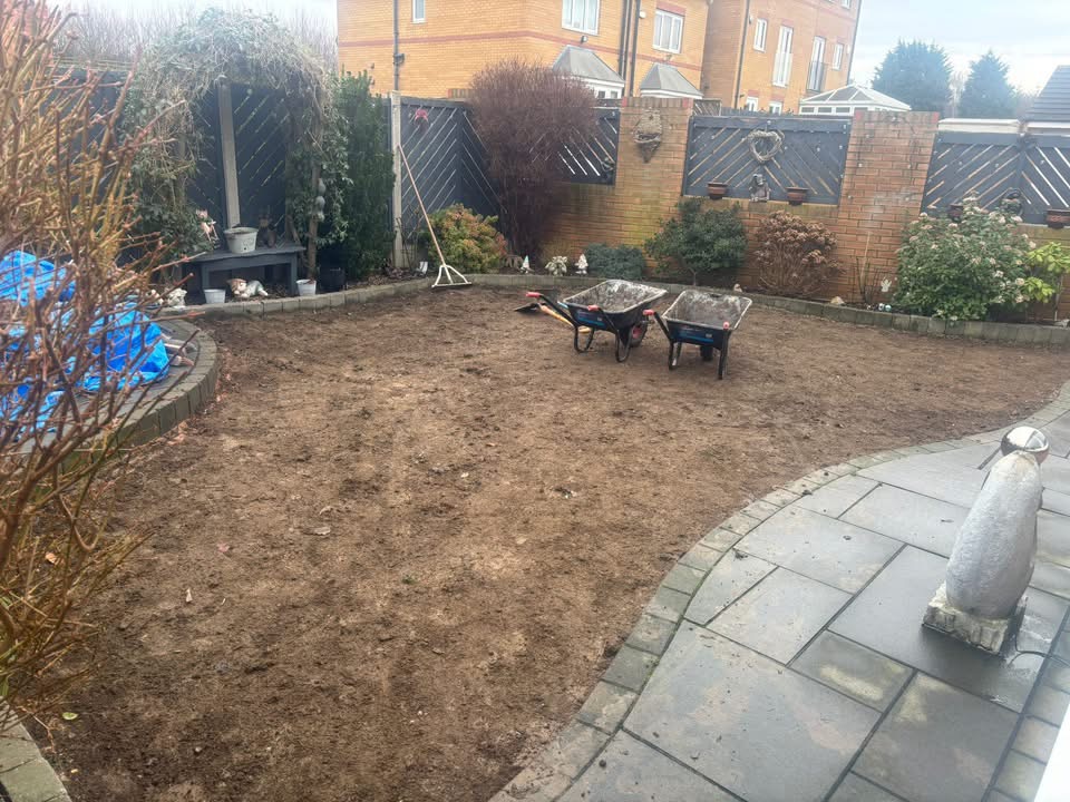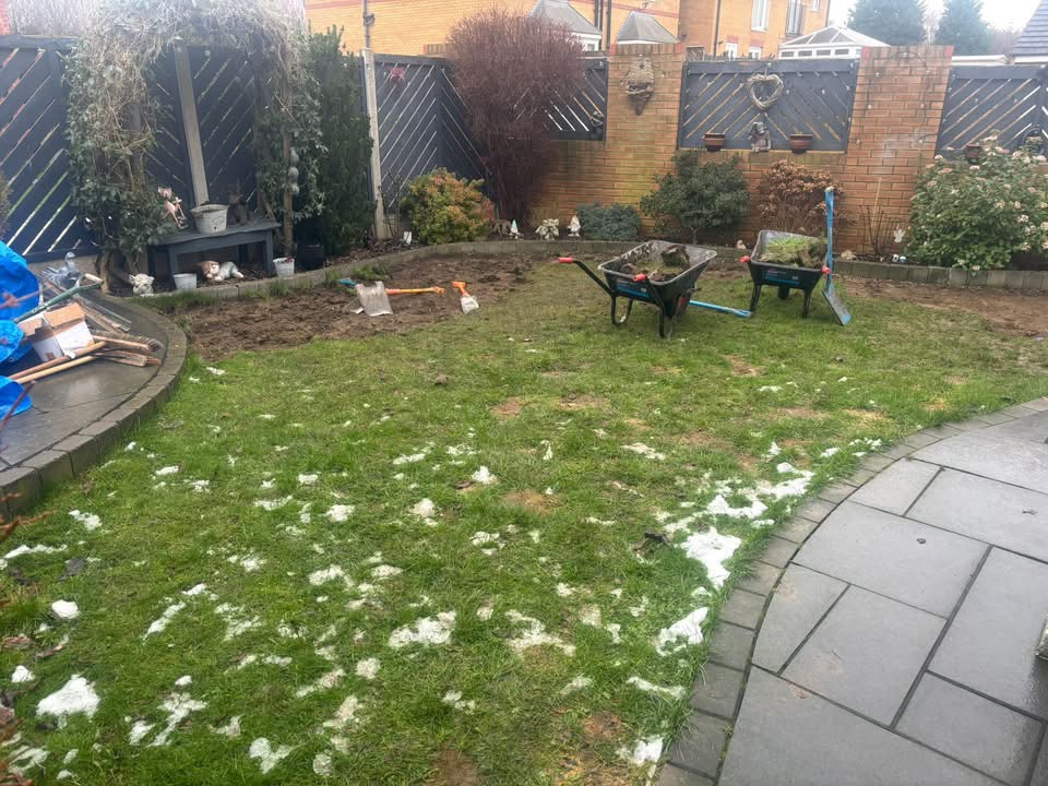 When our team arrived at this property in West Yorkshire, the garden was in need of serious attention. The grass was worn, patchy, and struggling to cope with the winter weather. Muddy areas had developed where the ground couldn’t drain properly, and it simply wasn’t a space the homeowners could enjoy year-round.