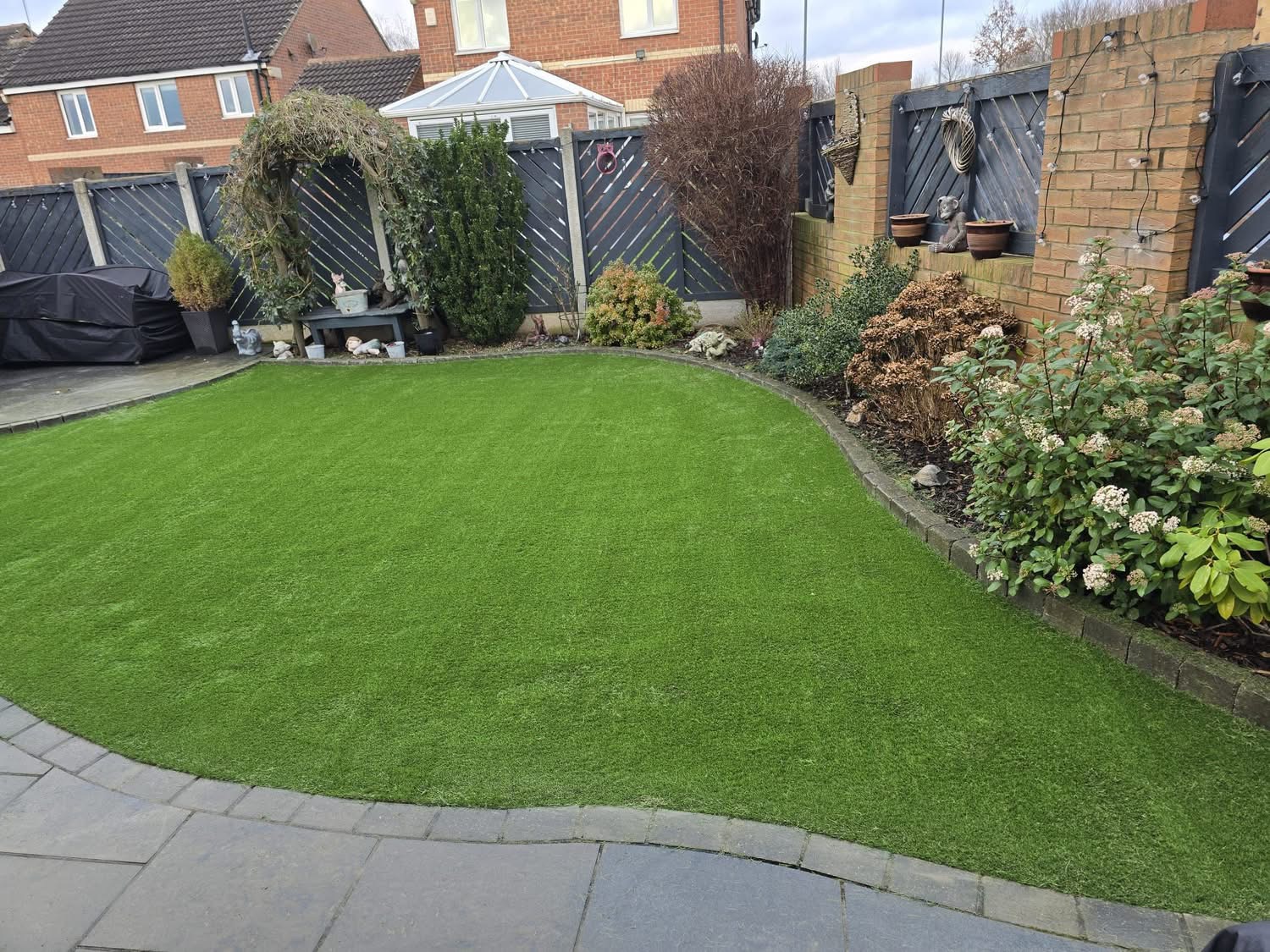 The homeowners contacted Eternal Lawns looking for a low-maintenance, durable, and attractive solution. After assessing the garden, we recommended one of our premium artificial grass ranges, designed to stay looking green and fresh through every season.